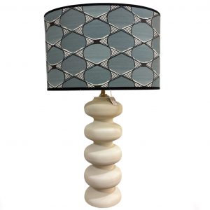 PANTALLA 45CM OVALADA DOBLE TEXTURA LINO BEIGE+ TERCIOPELO PETROL+ TELA RAYAS