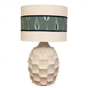 CILINDRO 43CM EN DOBLE TEXTURA LINO BEIGE + TELA JANE CHURCHILL+TERCIOPELO ARRIBA Y ABAJO VERDE PATO