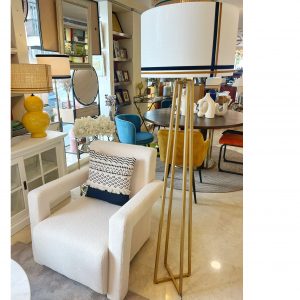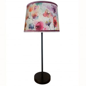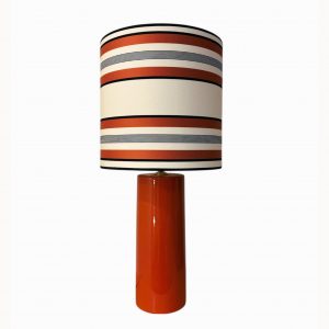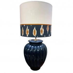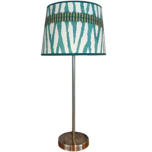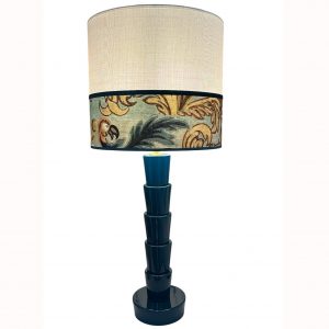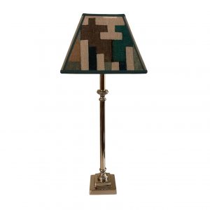 PANTALLA 20CM TRAPECIO CONFECCIONADA EN TELA GEOMÉTRICA + CINTA EN LOS TONOS DE LA TELA.
