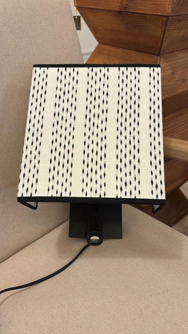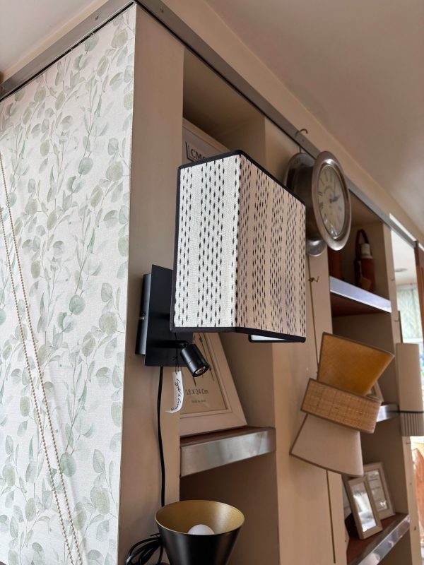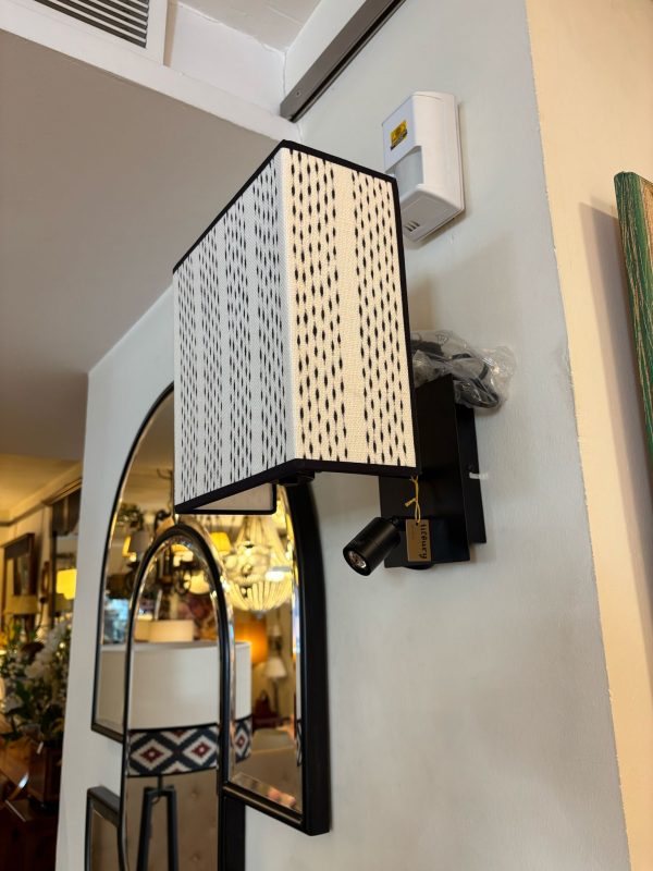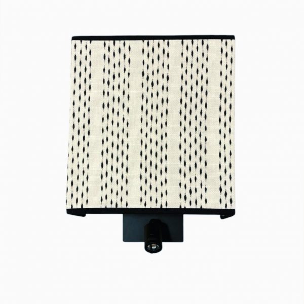 APLIQUE NEGRO MATE CON DOS PUNTOS DE LUZ. UN PUNTO DE LUZ CON PANTALLA PARA DAR ILUMINACIÓN DE AMBIENTE A LA ESTANCIA Y OTRO PUNTO DE LUZ ENFOCADO EN UNA ILUMINACIÓN DIRECTA PARA LECTURA POR EJEMPLO. LA PANTALLA ES UN CUBO DE 25CM CON TELA IKAT STRIPE DE JAMES MALONE.