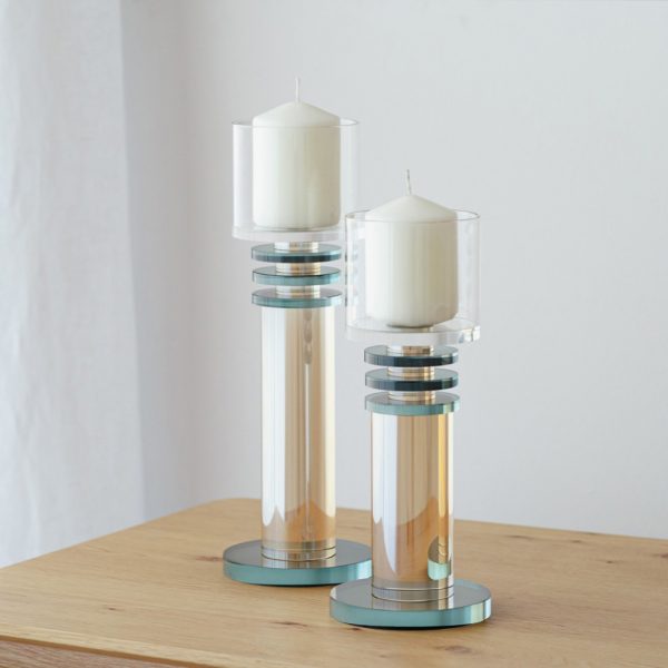 CANDELABRO KALA REALIZADO EN CRISTAL. EN ESTA PIEZA SE COMBINA LA TRANSPARENCIA DEL CRISTAL CON LOS TONOS CHAMPAGNE EN EL CILINDRO Y AZUL TURQUESA EN LAS PIEZAS CIRCULARES INTERMEDIAS Y LA BASE. UN ELEMENTO DE DECORACIÓN SERENO PERFECTO PARA LLENAR DE LUZ CUALQUIER ESTANCIA. TAMAÑO GRANDE. PIEZAS EN CRISTAL PULIDO COLOREADO.