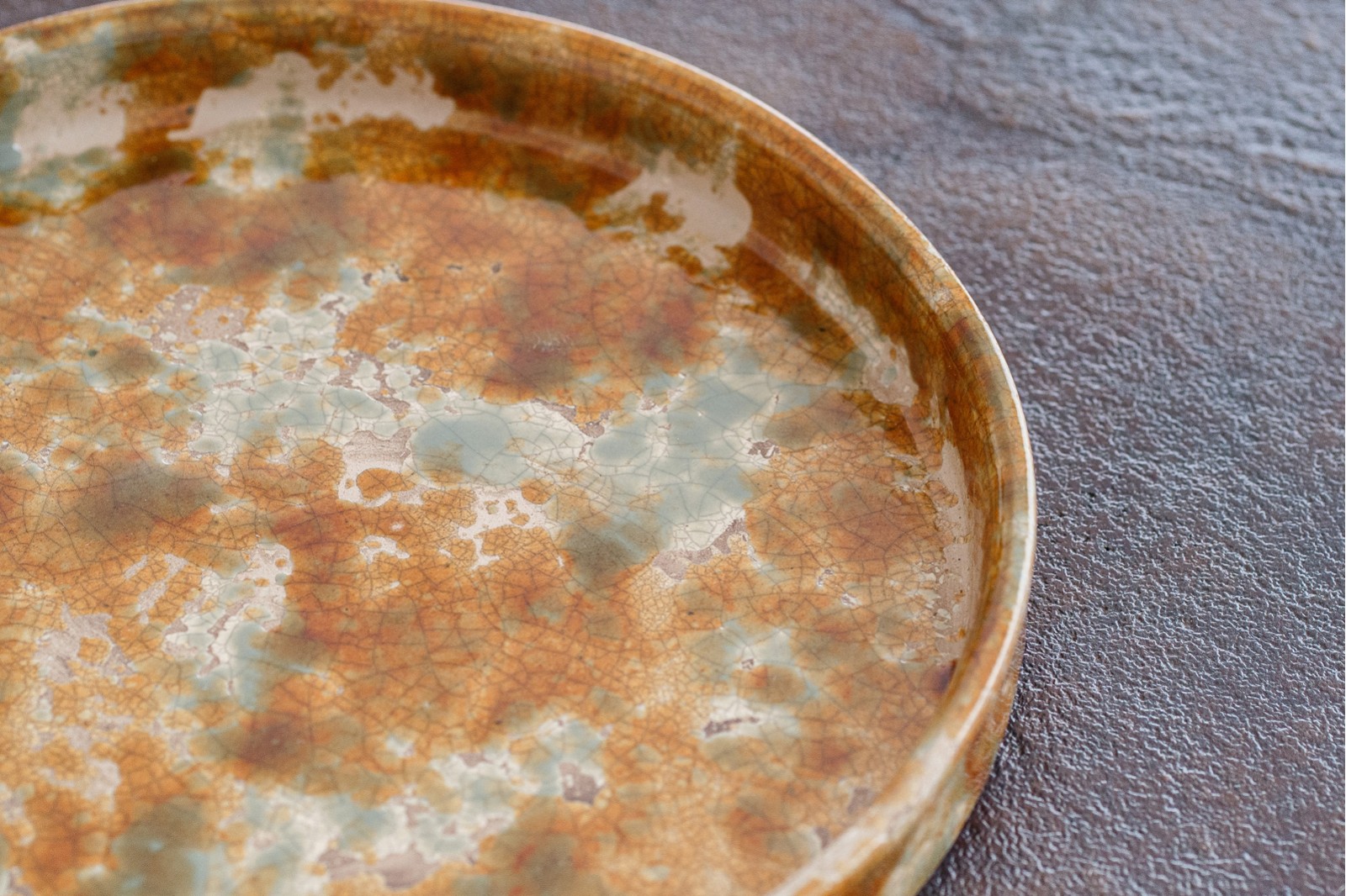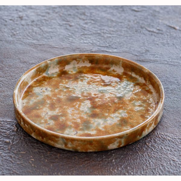 CENTRO DE MESA COLECCIÓN CIAN.TAMAÑO PEQUEÑO. CENTRO REDONDO REALIZADO EN BARRO EN EL QUE SE COMBINAN TONOS VERDE AGUA OCRE Y BEIGE EN SU VIDRIADO. EL VIDRIADO NO LLEGA A CUBRIR LA PIEZA POR COMPLETO DEJANDO ESPACIOS DONDE SE PERCIBE LA RUGOSIDAD DE LA PASTA CERÁMICA NATURAL. EL DECORADO DE ESTAS PIEZAS SE REALIZA A MANO POR LO QUE EL PROCESO DE VIDRIADO ES DIFERENTE EN CADA UNA Y LOS VIDRIOS EMPLEADOS REACCIONAN DE MANERA DIFERENTE EN EL HORNO DE COCCIÓN LO QUE APORTA A CADA PIEZA UN CARÁCTER ÚNICO Y DISTINTO. -DADO EL CARÁCTER ARTESANAL DE ESTAS PIEZAS Y LO ESPECIAL DE SU VIDRIADO ES POSIBLE QUE HAYA VARIACIONES DE COLOR Y ACABADO.