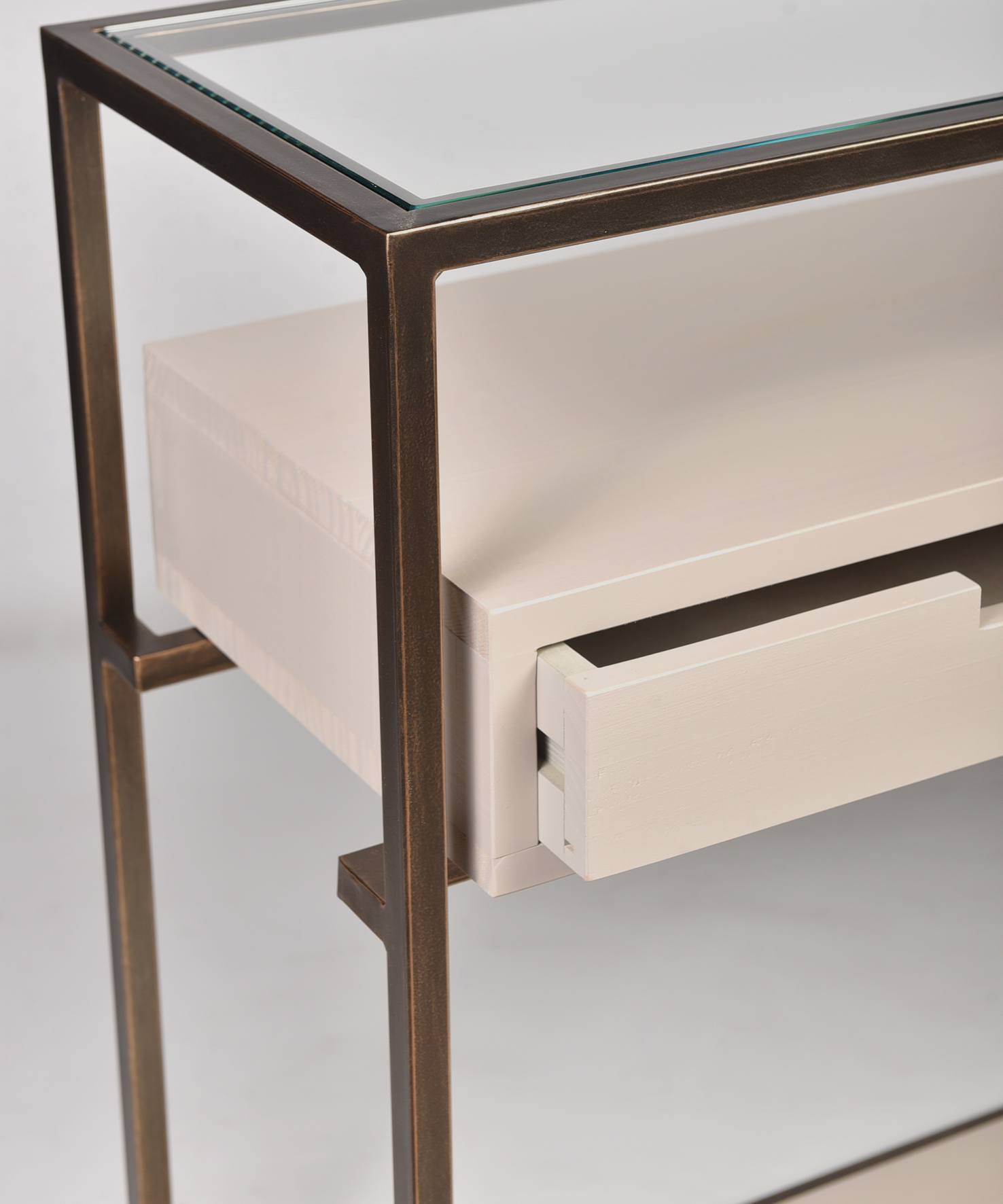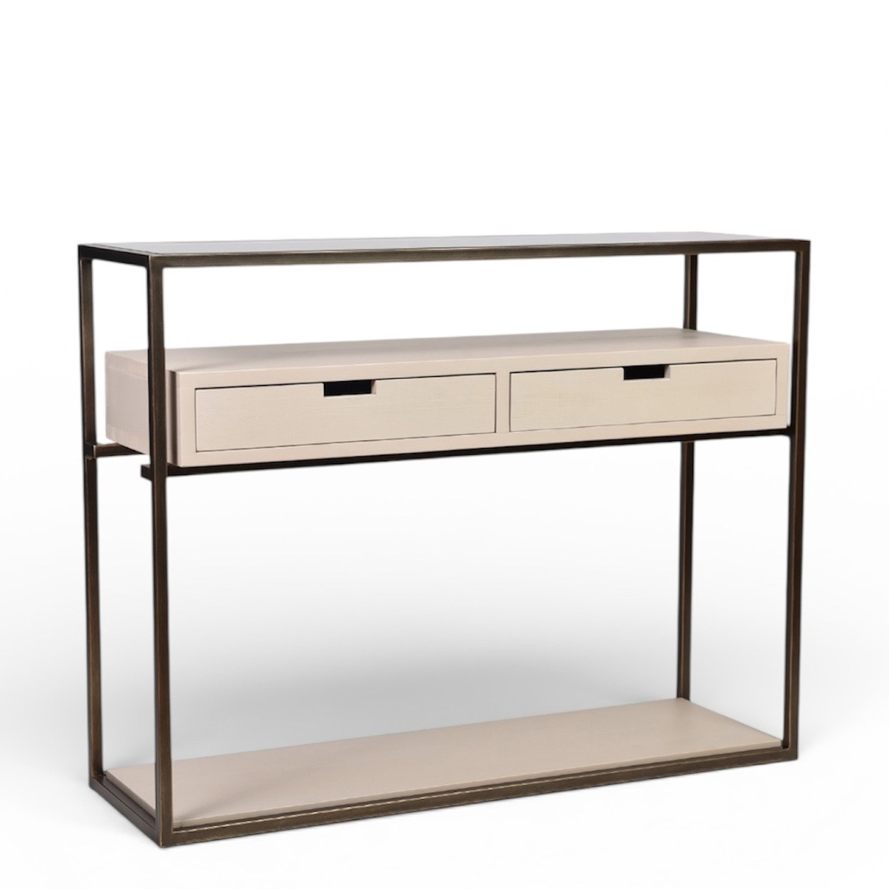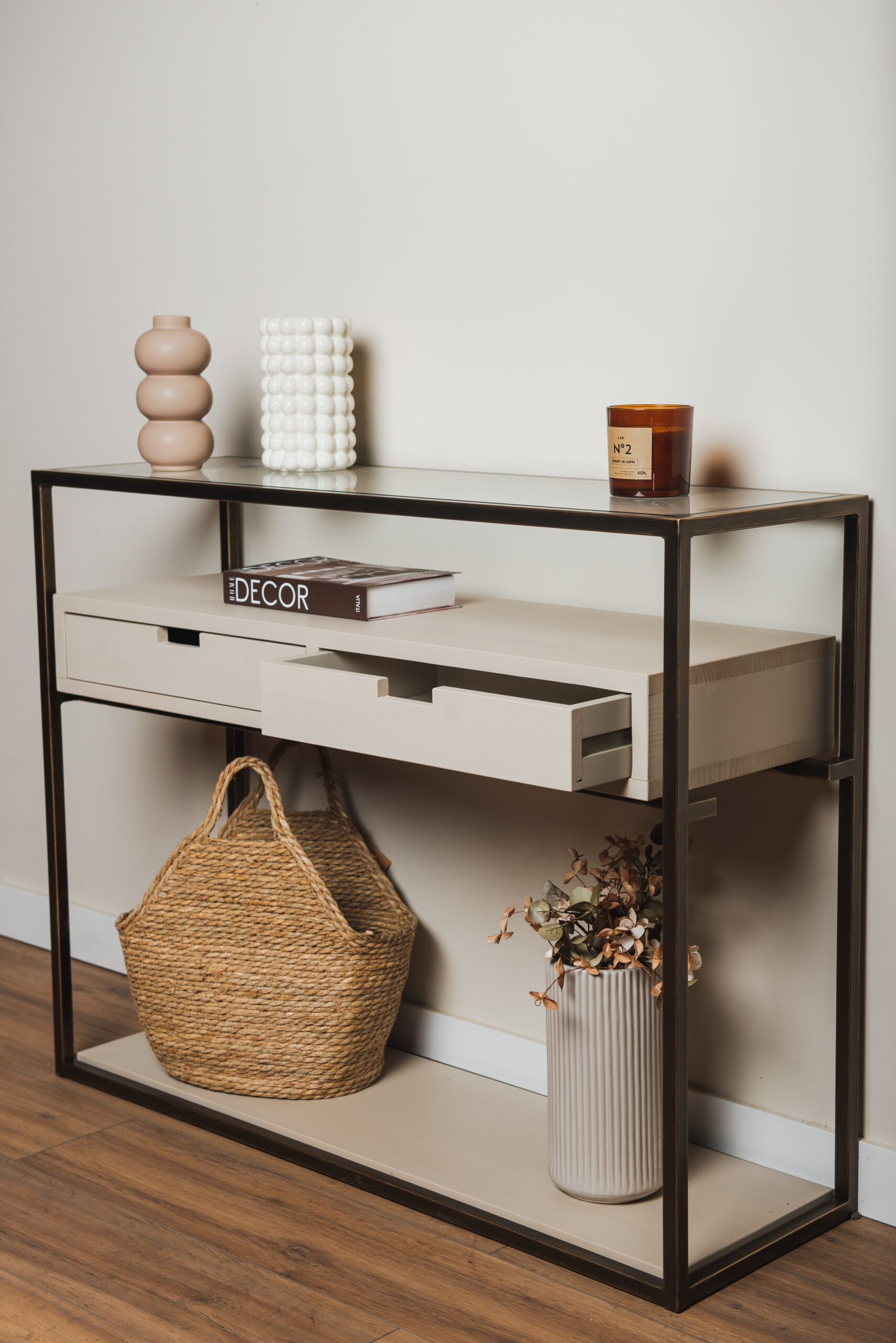 CONSOLA ACABADO MADERA LACADA TONO BRRISA + ACABADO METAL CUERO EN MEDIDA 110X35X85CM