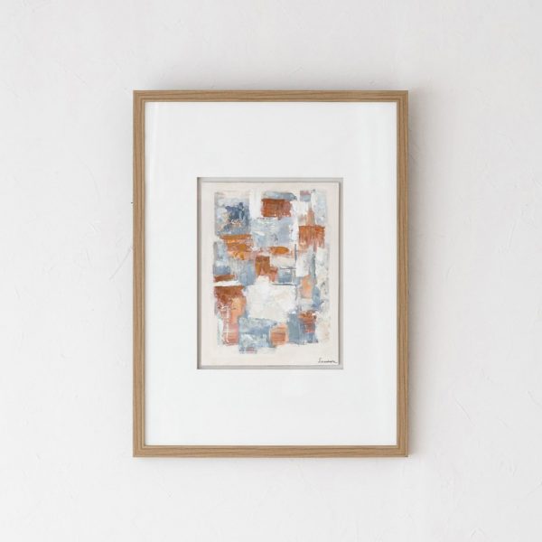 CUADRO ABSTRACTO AGUA Y TIERRA N2. PINTURA REALIZADA A MANO SOBRE LIENZO. MEZCLA TONOS AZULES MARRONES Y BEIGE QUE SE APLICAN CON PINCELADAS DE TEXTURA GRUESA REPRESENTANDO LOS ELEMENTOS DEL AGUA Y LA TIERRA. ENMARCADO CON PASPARTÚ EN TONO BLANCO ROTO VIDRIO Y MARCO EN TONO ROBLE.