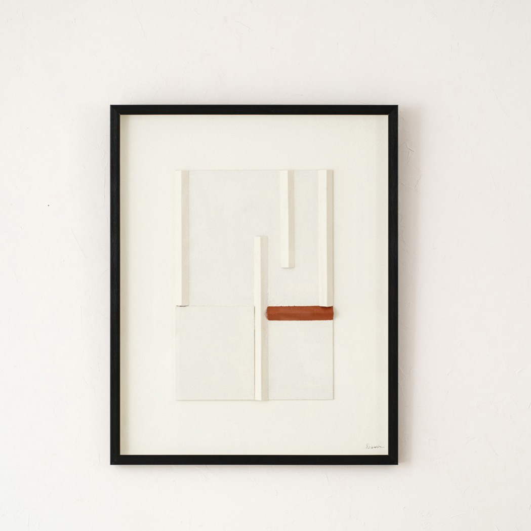 CUADRO FORMAS TERRACOTA. COMPOSICIÓN ABSTRACTA DE INSPIRACIÓN GEOMÉTRICA REALIZADA EN DM SOBRE LA QUE SE HA APLICADO UNA PINTURA CON TEXTURA ARENA EN UN TONO BLANCO CÁLIDO. EL CONTRASTE A LA CALMA DE LA COMPOSICIÓN SE INTRODUCE CON UN TRAZO EN COLOR TERRACOTA QUE SE APLICA SOBRE UNO DE LOS RELIEVES. LA COMPOSICIÓN SE HA ENMARCADO UTILIZANDO CRISTAL Y UN MARCO EN COLOR NEGRO. . IDEAL PARA AÑADIR UN TOQUE CONTEMPORÁNEO A CUALQUIER ESPACIO.