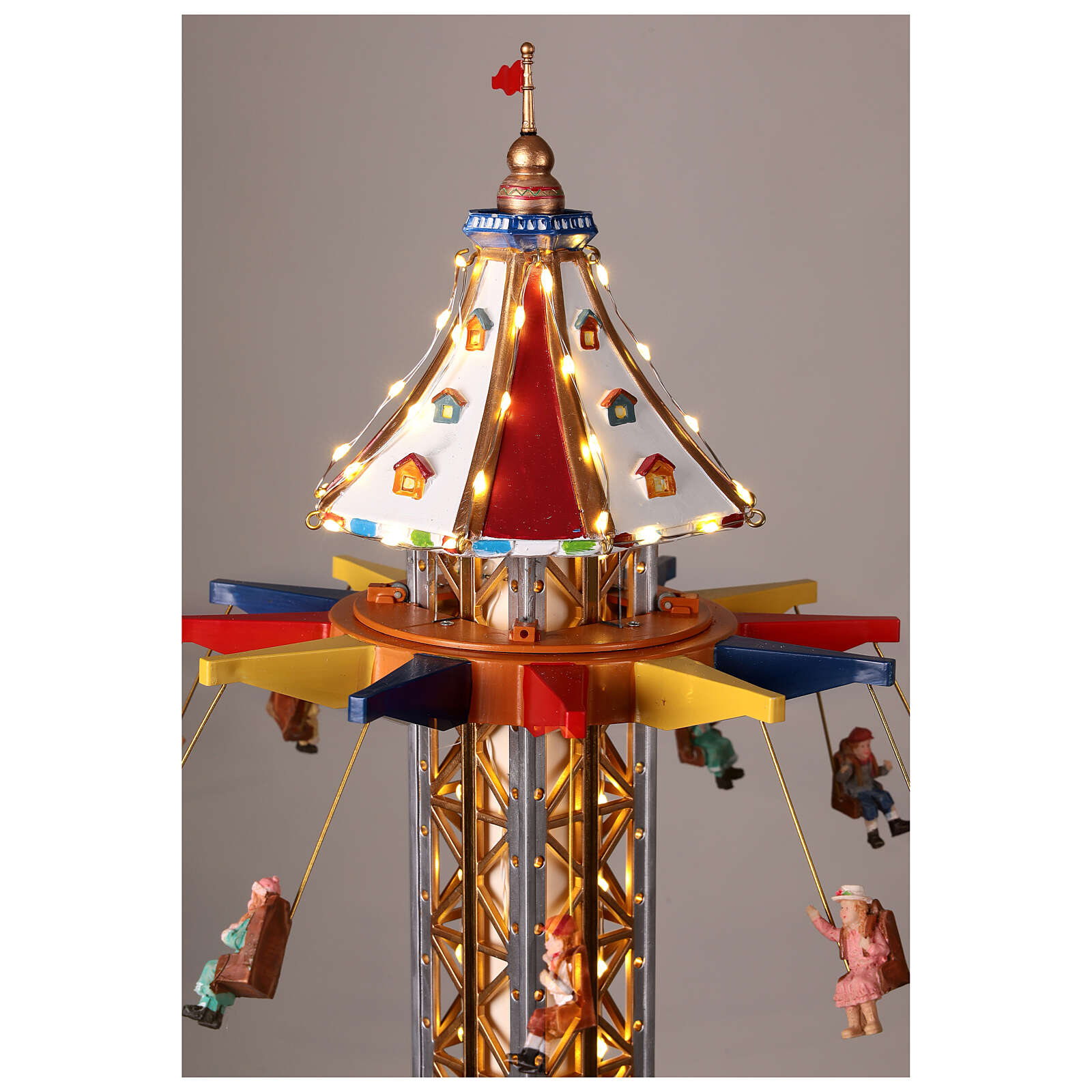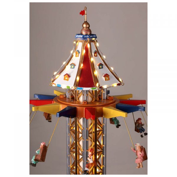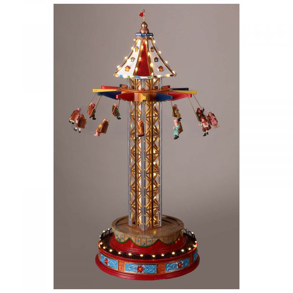 Este encantador diorama navideño representa un carrusel de sillas voladoras, con luces, música y movimiento.
