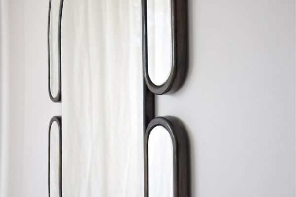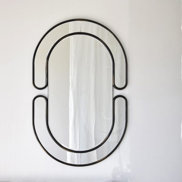ESPEJO DE FORMA OVALADA PARA COLOCAR EN PARED. LA FORMA DEL ESPEJO SE POTENCIA A TRAVÉS DE DOS MARCOS EN ESPEJO NO SIMÉTRICOS QUE REALZAN LA FORMA OVALADA. SE JUEGA CON EL ESPEJO CON BORDES BISELADOS Y MARCO EN DM ACABADO EN NEGRO ORO DE ESTETICA CONTEMPORÁNEA. POSICION VERTICAL Y HORIZONTAL.