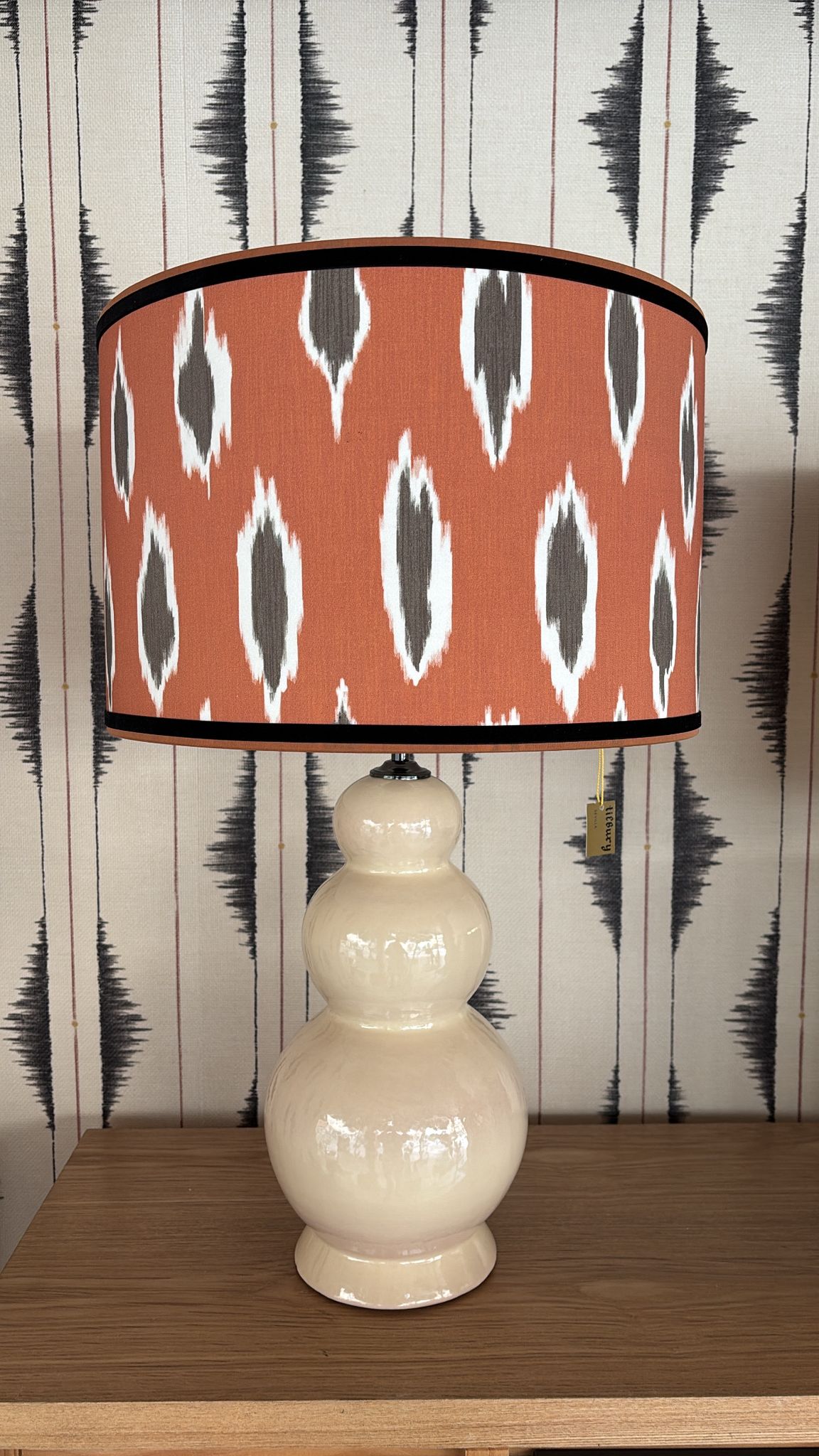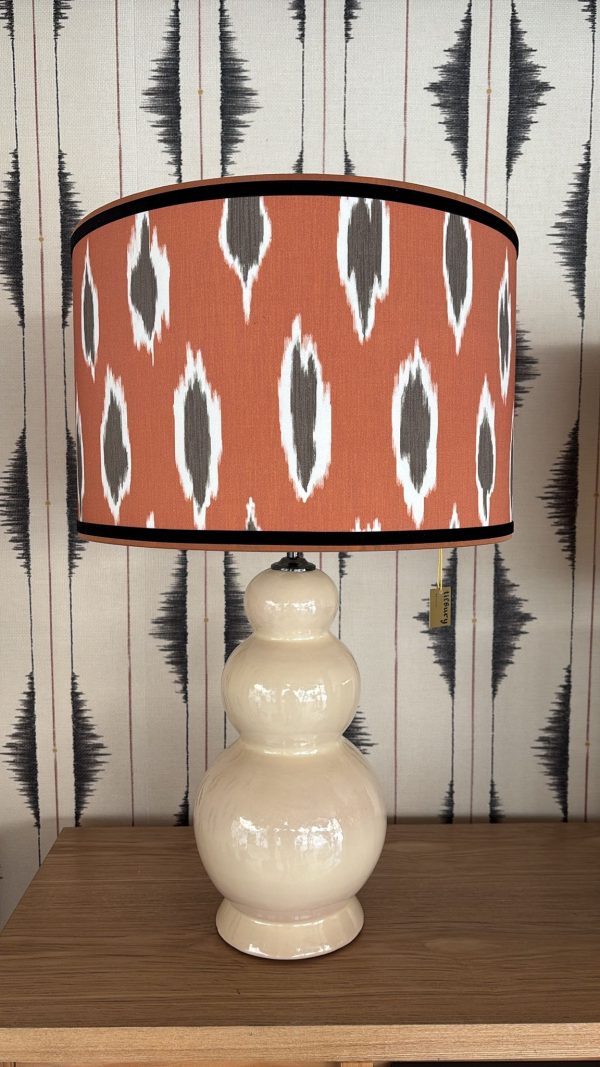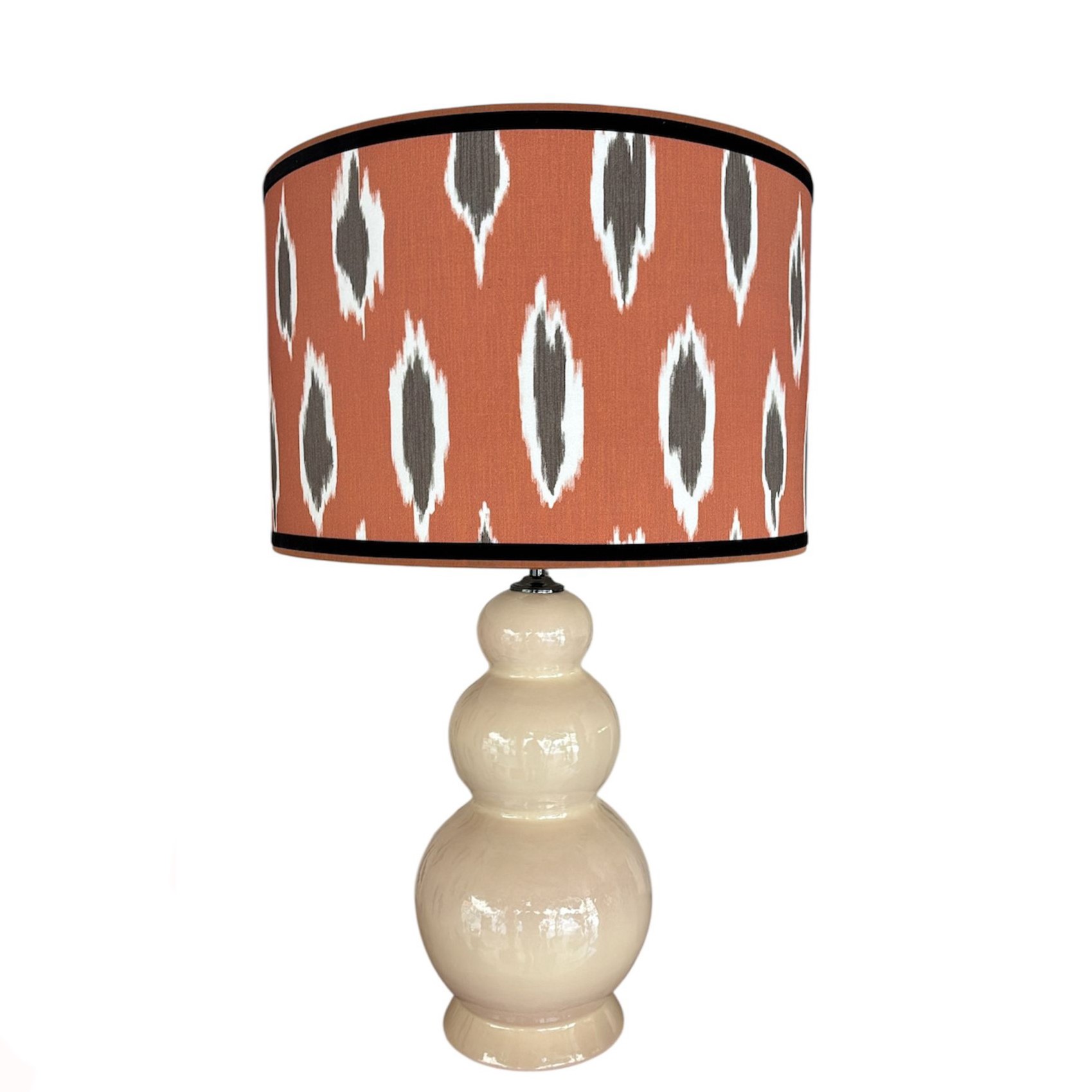Lámpara de sobremesa de alta decoración hecha a mano en torno alfarero con diseño especial de tres bolas. Esmaltada en color beige con pantalla exclusiva: