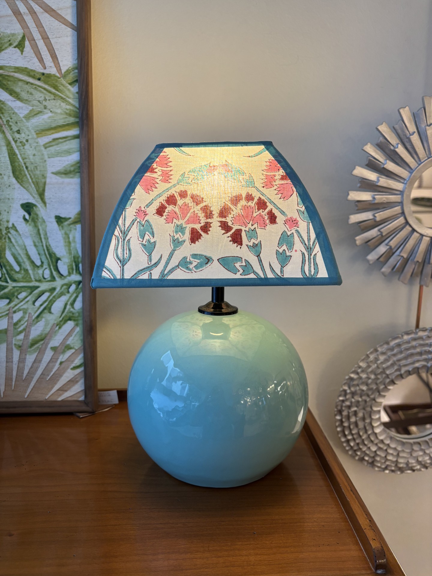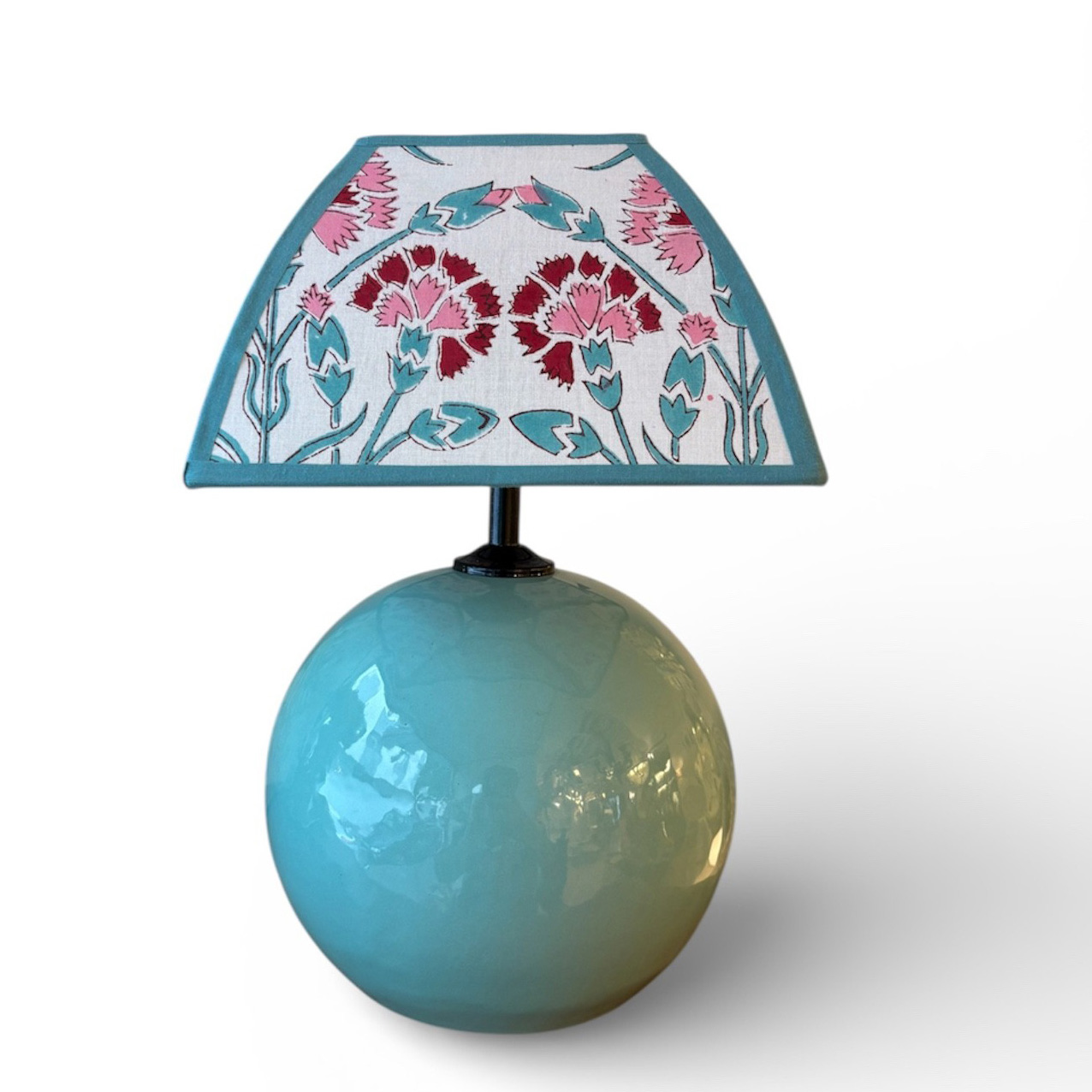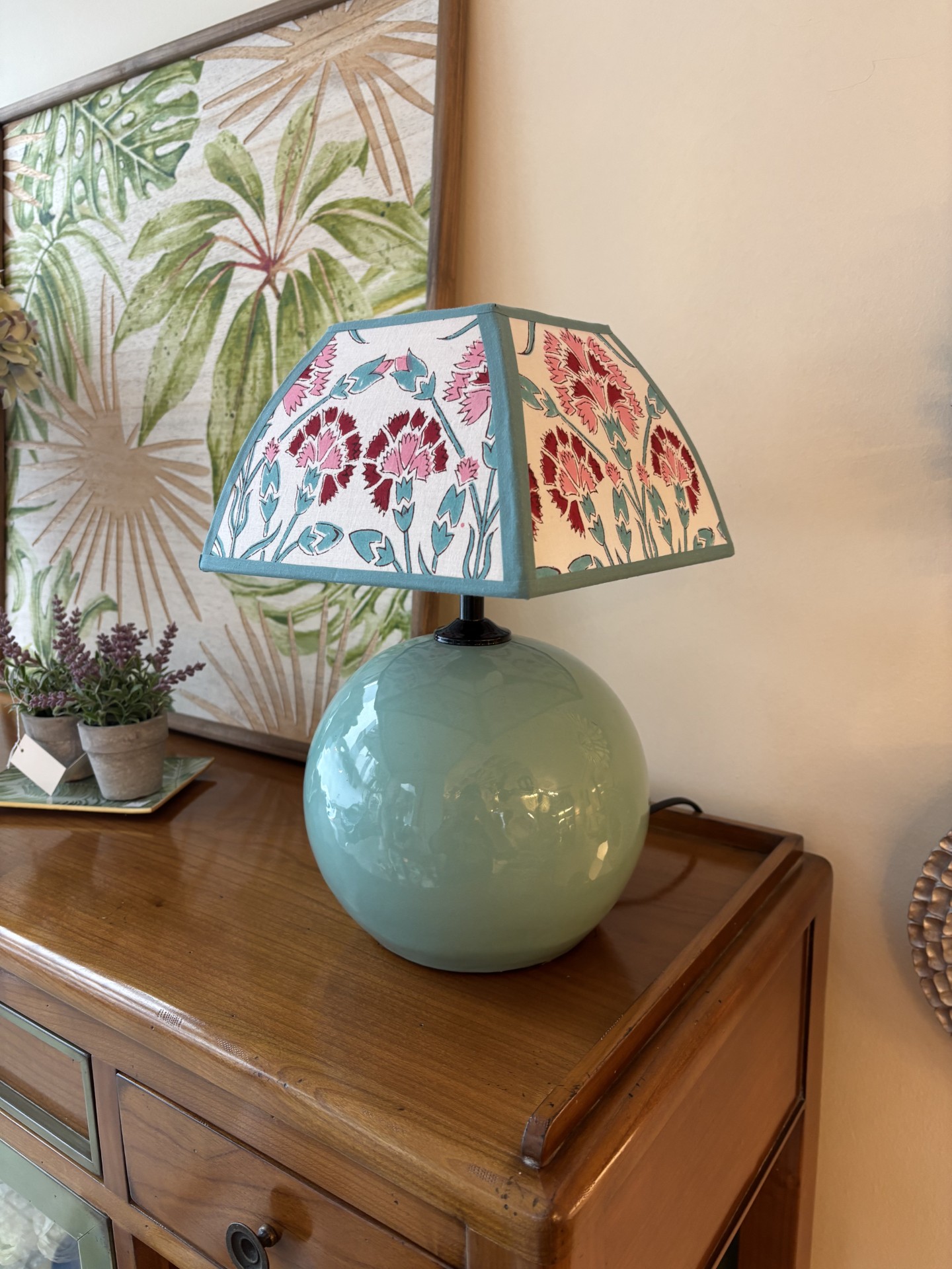 Lámpara de sobremesa de alta decoración hecha a mano en torno alfarero con diseño especial de bola. Esmaltada en color verde agua con pantalla exclusiva rectangular elsa en tela flores + cintas al tono.