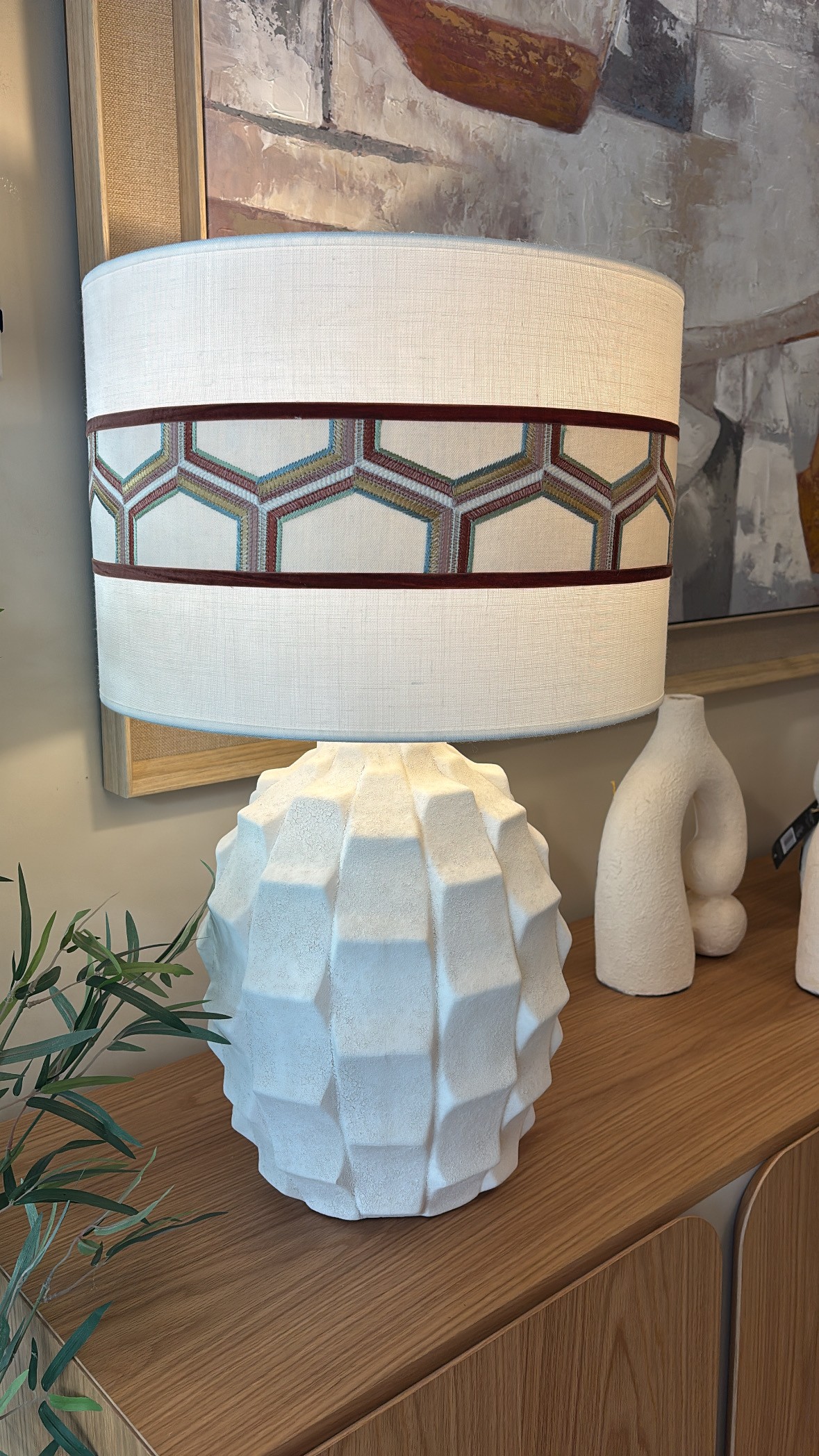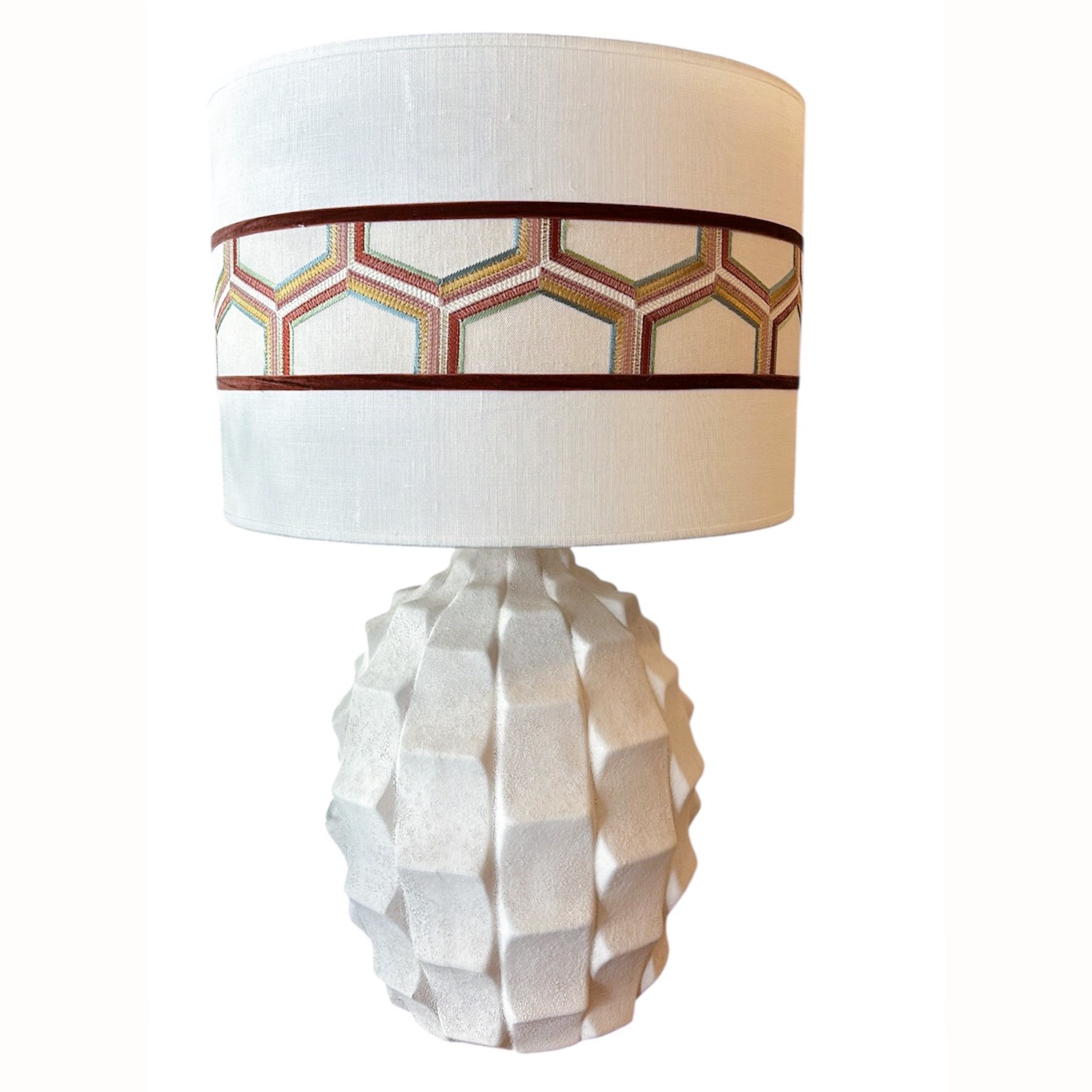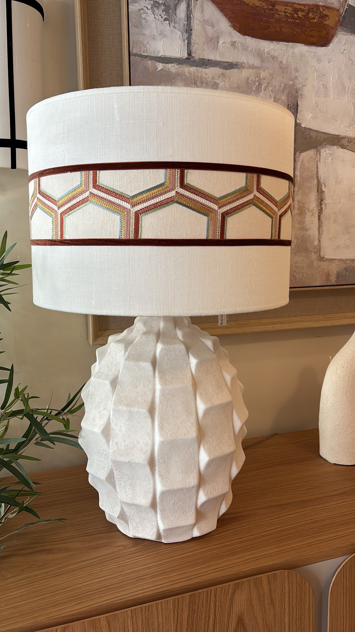 LÁMPARA DE MESA REALIZADA EN PASTA CERÁMICA CON ACABADO NATURAL LIGERAMENTE RUGOSO EVOCANDO UNA TEXTURA PÉTREA. PANTALLA CILÍNDRICA REALIZADA EN DOBLE TEXTURA LINO BEIGE + TELA JANE CHURCHILL+TERCIOPELO ARRIBA Y ABAJO CALDERA. MEDIDAS BASE LAMP: 28X41CM. MEDIDA PANTALLA:43XH29CM