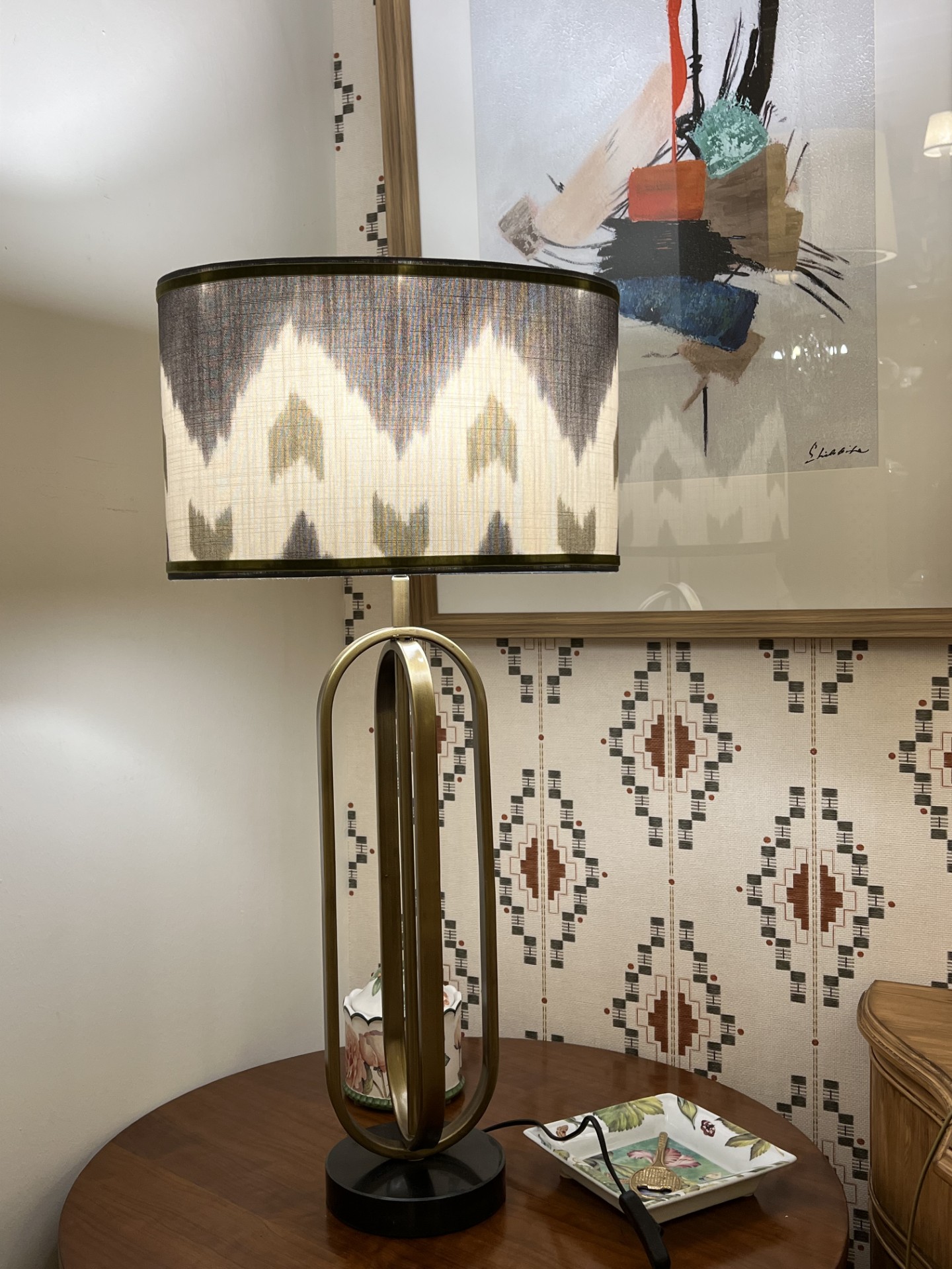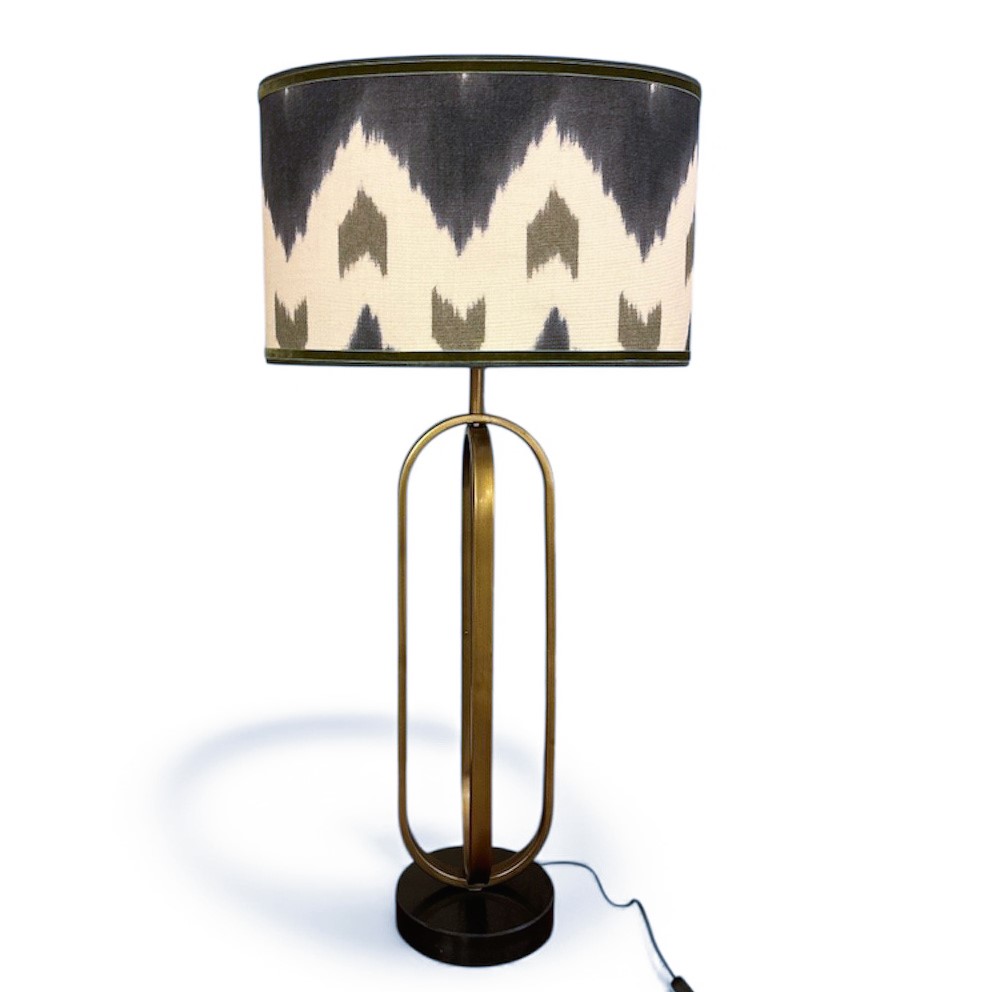 LÁMPARA SOBREMESA ASTER REALIZADA EN METAL COLOR BRONCE Y PEANA EN NEGRO. PANTALLA 45 OVALADA TELA GUELL LAMADRID+ TERCIOPELO ARRIBA Y ABAJO VERDE AL TONO DEL ESTAMPADO.