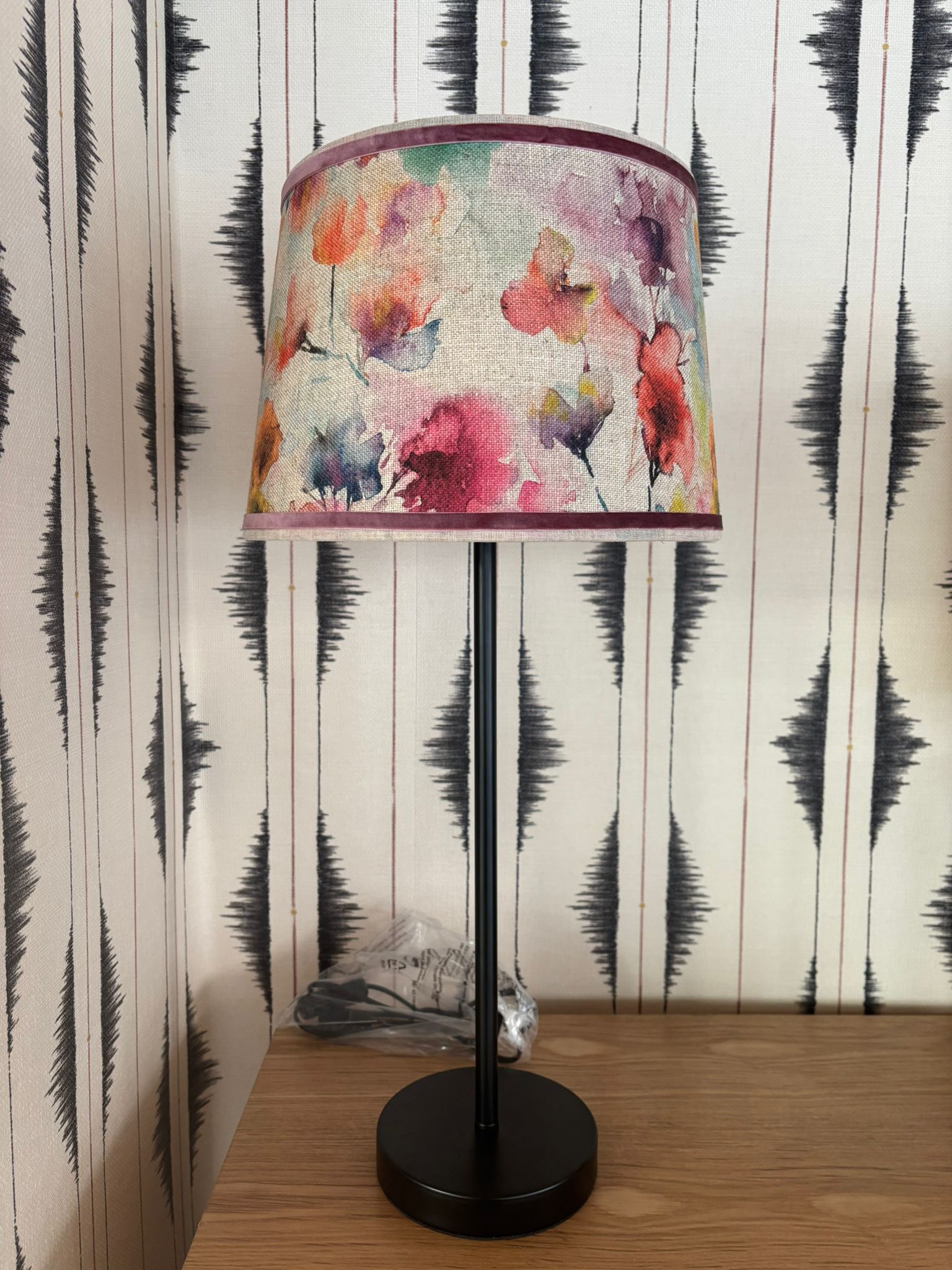 PANTALLA CÓNICATEJIDO FLORES TERCIOPELOS MORADOS ARRIBA Y ABAJO 25X30X20CM