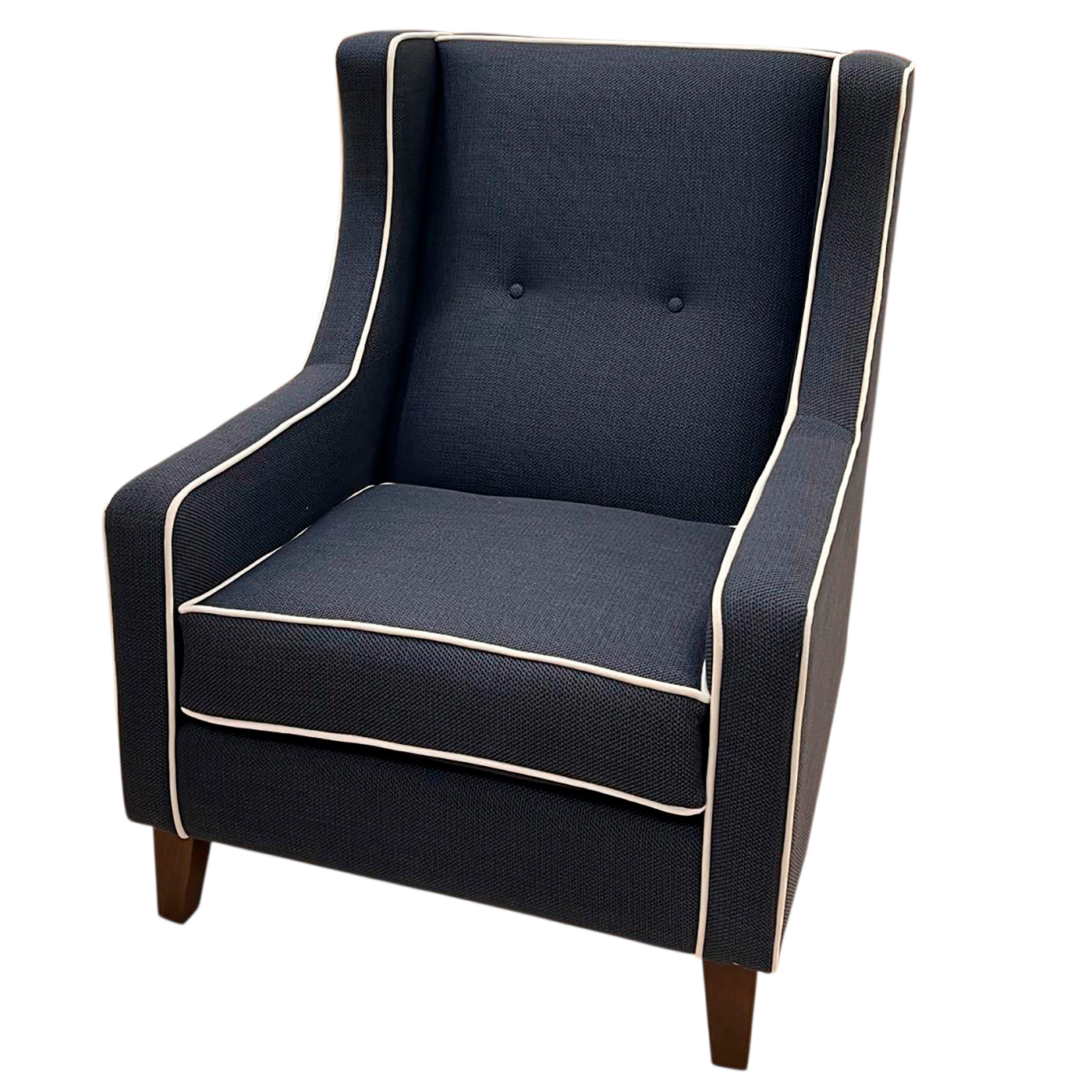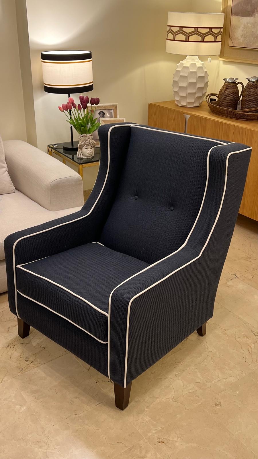 SILLÓN TRIBECA CONFECCIONADO EN TELA FELICE OCEAN Y VIVO ROSETA BLANCO. PATAS EN HAYA BARNIZADA.